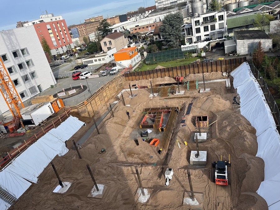 Auf einem Baufeld von 44 x 30 m wurde ein U-förmiges Gebäude mit 4 Vollgeschossen und einem Untergeschoss mit Tiefgarage erstellt.